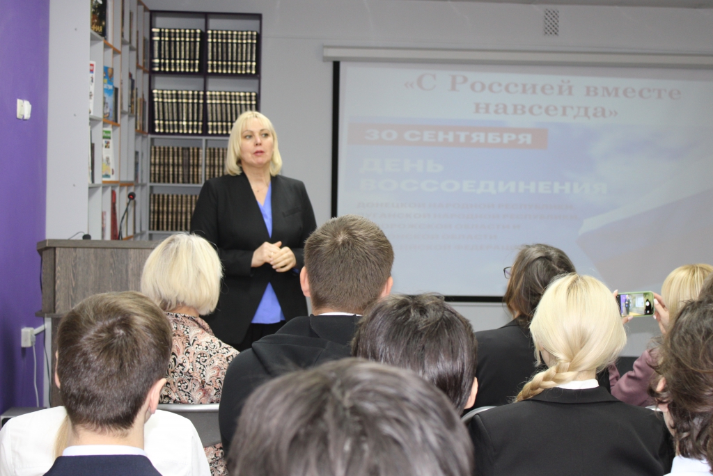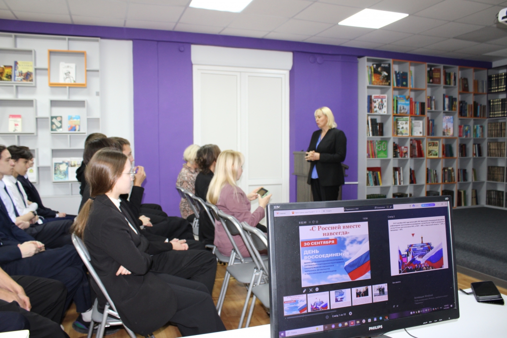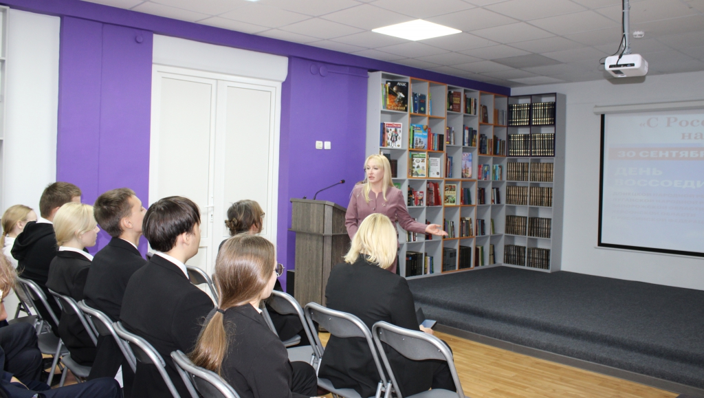 30 сентября в Чувашской республиканской детско-юношеской библиотеке состоялся историко-патриотический час «С Россией вместе навсегда!», на который были приглашены десятиклассники чебоксарской школы № 49. Почетными гостями встречи стали Министр культуры, по делам национальностей и архивного дела Чувашской Республики Светлана Анатольевна Каликова и лектор Российского общества «Знание», ветеран органов Прокуратуры Российской Федерации, преподаватель Чебоксарского профессионального колледжа им. Н.В. Никольского, советник юстиции Ирина Георгиевна Иванова.