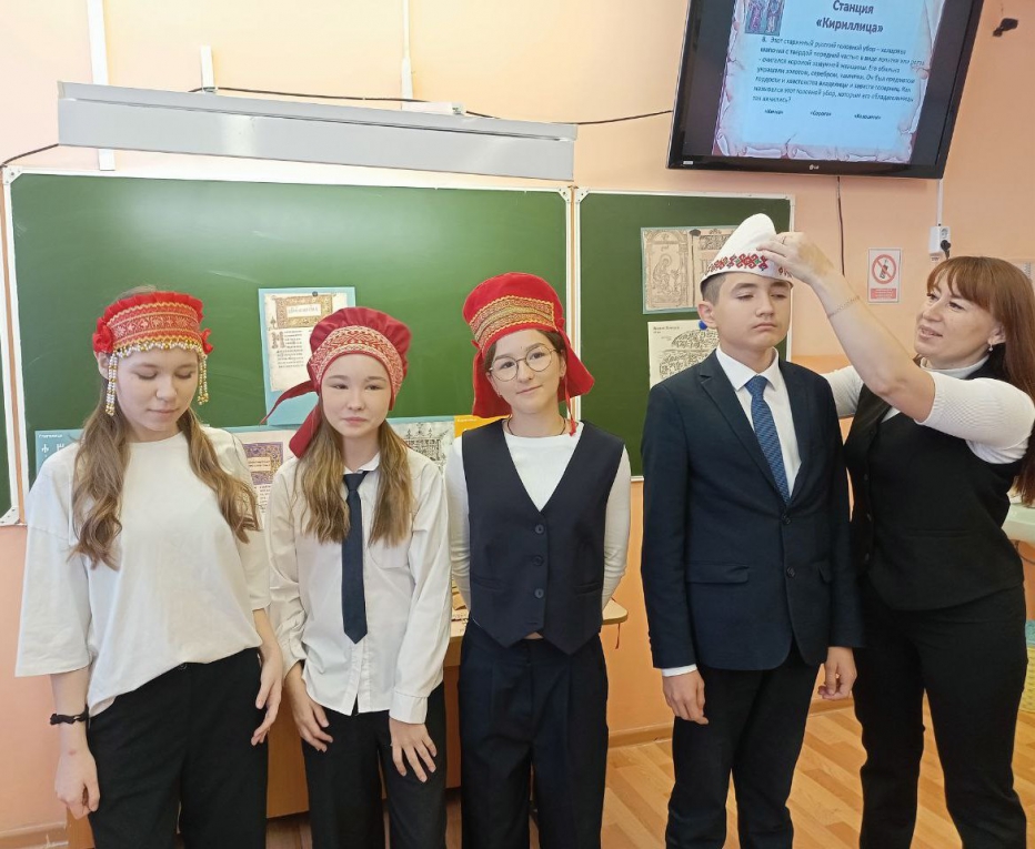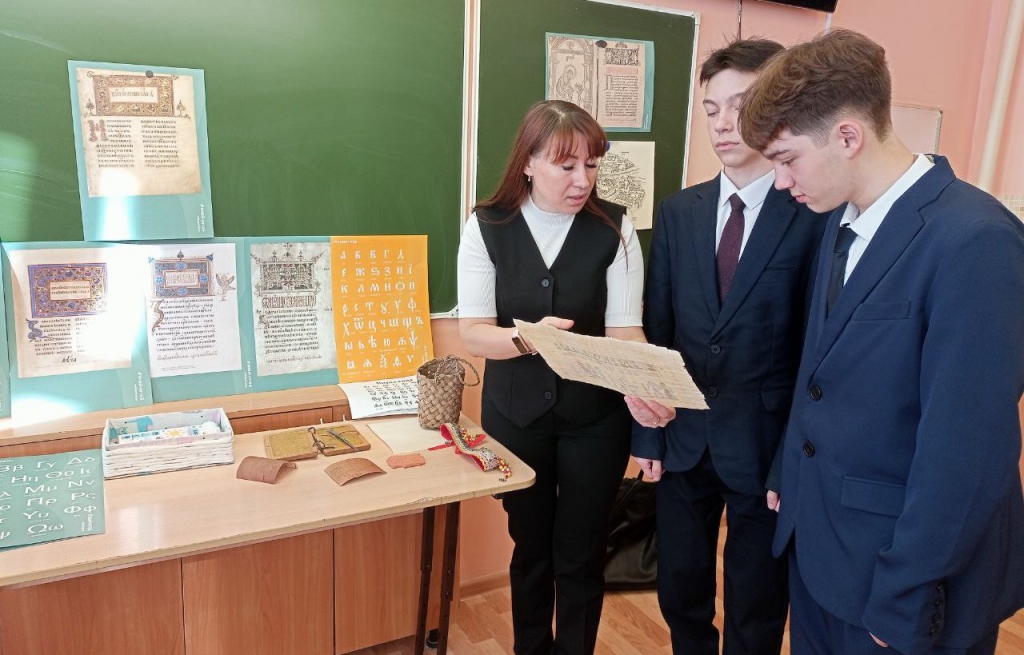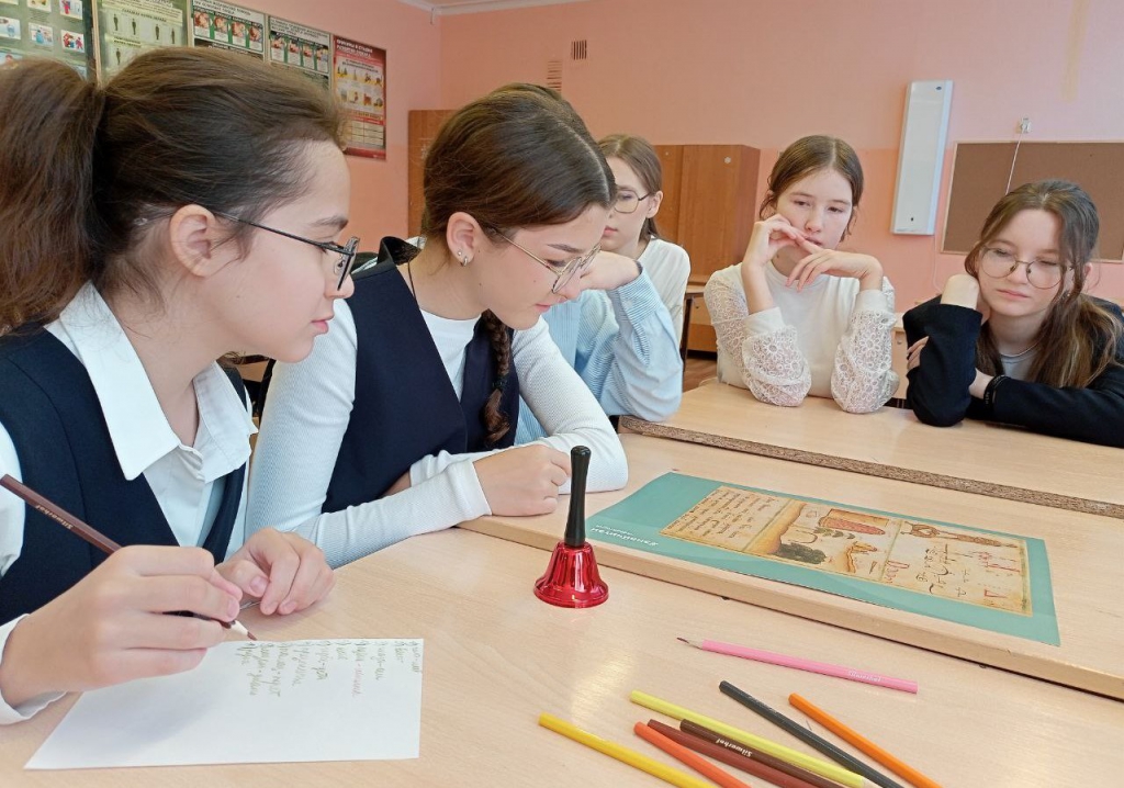 Разделившись на две дружные команды, восьмиклассники погрузились в атмосферу старинных библиотек и скрипториев. На станции «Глаголица» они называли старославянские слова и их значение. На «Страноведении» – расшифровывали запутанные слова и называли части тела на старославянском языке, как это делали наши предки много веков назад и, удивляясь, насколько богат и разнообразен был язык наших предков. Также отвечали на вопросы об истории грамотности на Руси, а на «Поварне» ребята называли старинные предметы быта. В ходе игры участники смогли не только прикоснуться к наглядным материалам – бересте, пергаменту, цере и глиняным табличкам с загадочными символами, но и понять, как развивалась русская культура, язык и литература.