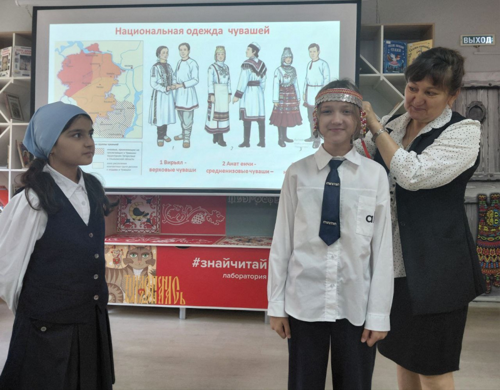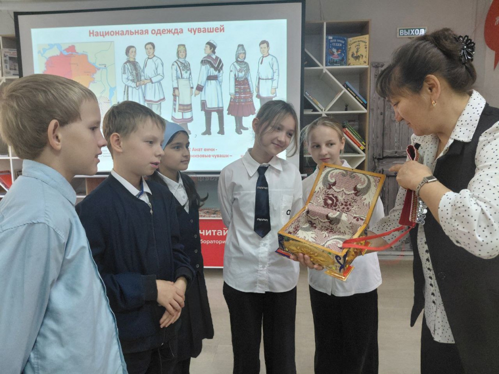 Занятие завершилось интерактивной частью, где школьники отвечали на вопросы и изучали элементы чувашского национального костюма, углубляя свои знания о культурном наследии родного края.