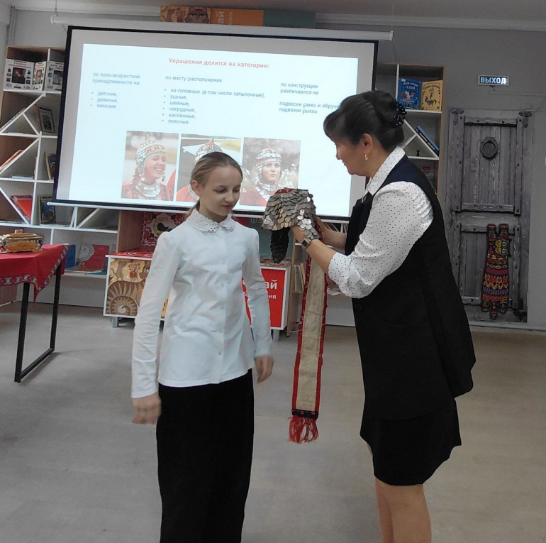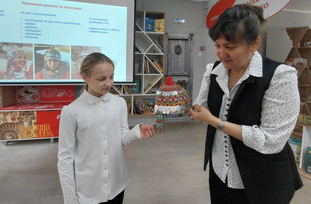Практическая часть занятия включала определение современных украшений и анализ возможных технологий их изготовления. Затем ребятам были представлены традиционные чувашские головные уборы и украшения – неотъемлемая часть национального костюма. Татьяна Захарова отметила, что в создании этих шедевров часто использовались разноцветный бисер, серебряные монеты и их более доступные аналоги.