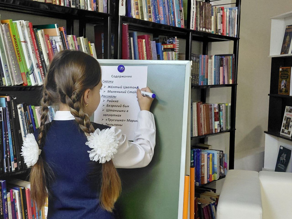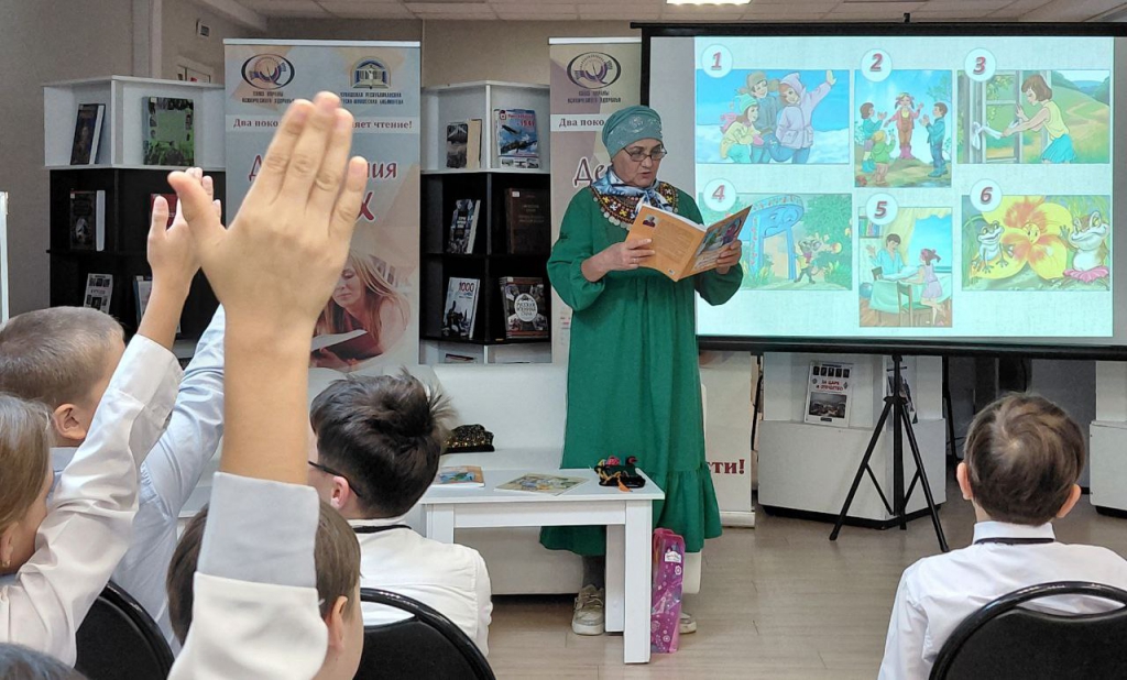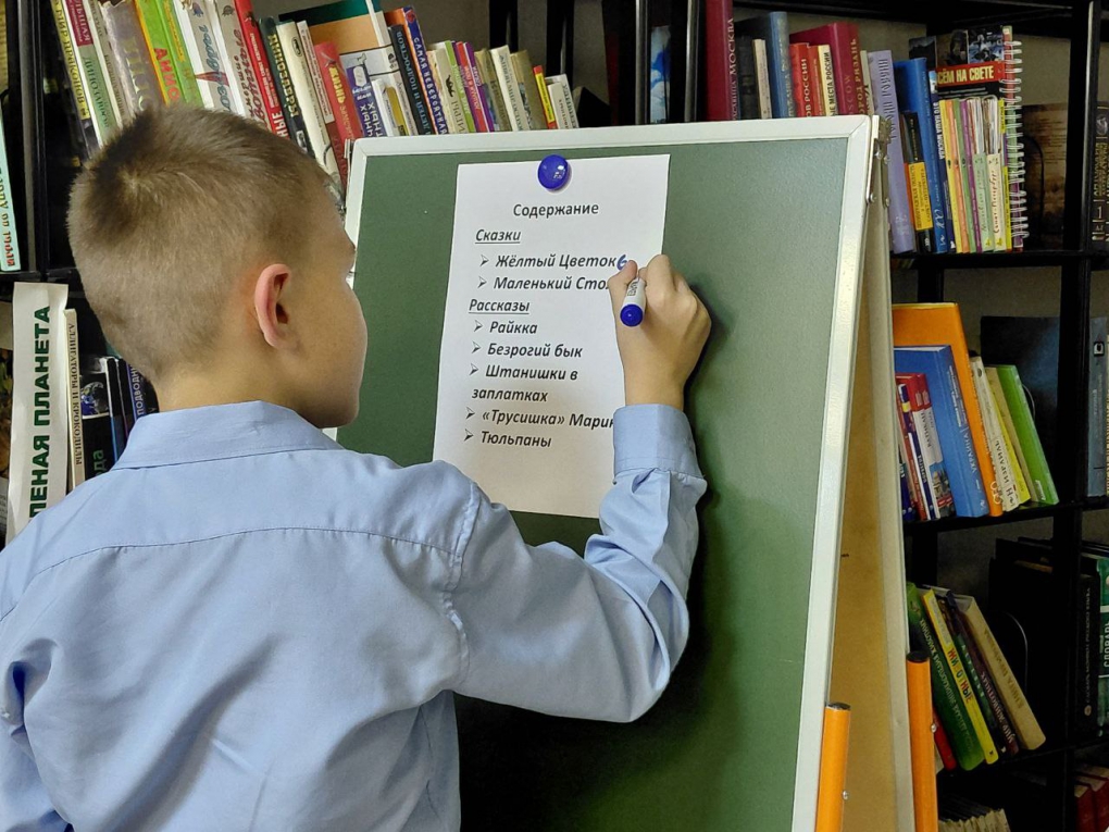 Интерактивная часть программы включала командное состязание. Ребята разделились на две группы: «Саплӑклӑ шӑлавар» и «Штанишки в заплатках». Раиса Сарпи зачитывала отрывки из произведений, а команды соревновались в поиске соответствующих иллюстраций на экране. По очереди участники выходили к мольберту, где нужно было сопоставить название рассказа с номером рисунка.