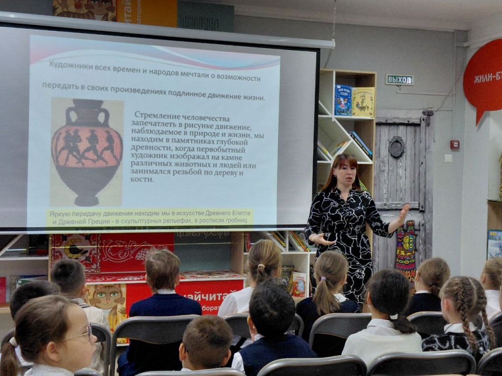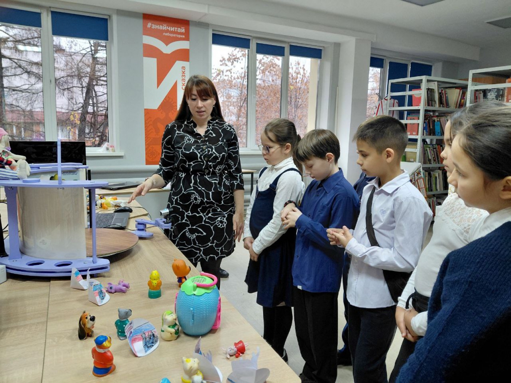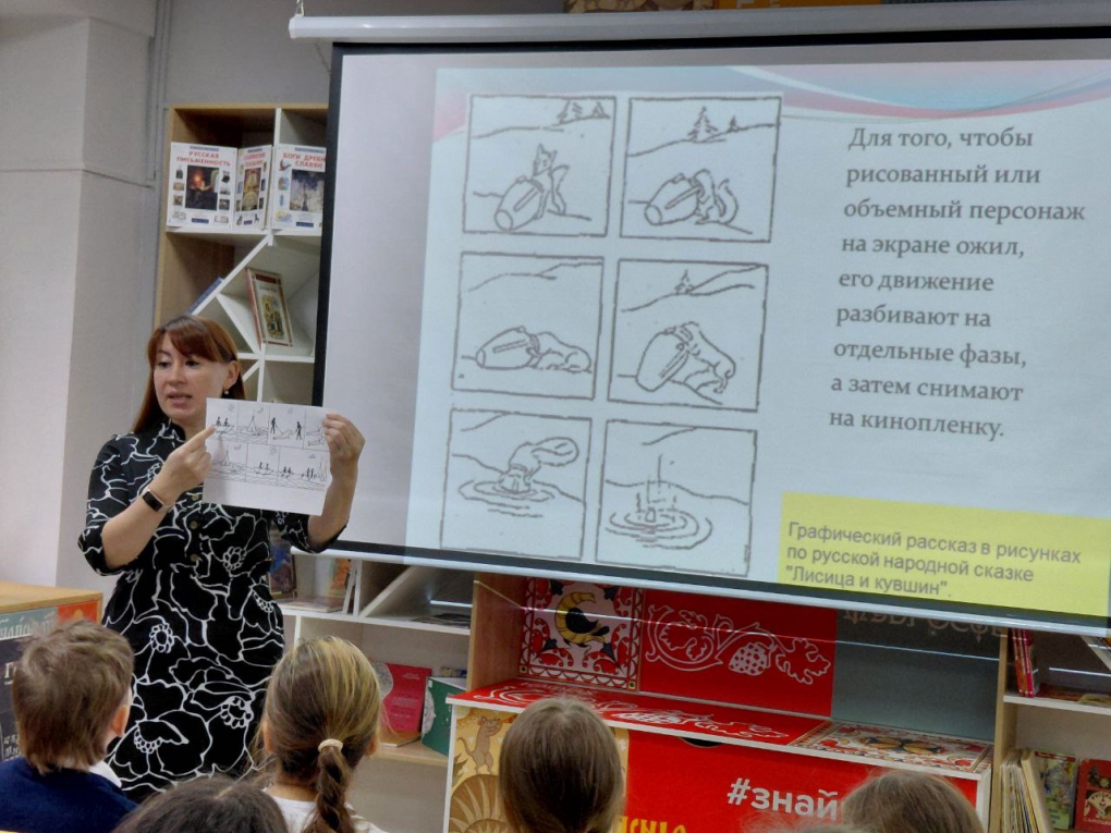 В Лаборатории детского и подросткового чтения #ЗнайЧитай руководитель Наталья Степанова познакомила ребят с историей возникновения мультипликации. Школьники узнали о том, как на свет появились такие персонажи, как Варежка, крокодил Гена и др.