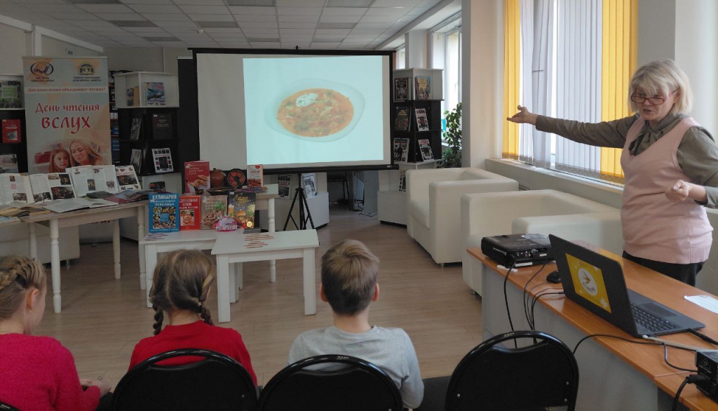 В библиотеке участники отгадывали загадки о самых известных блюдах нашей многонациональной кулинарии: окрошке, каше, щах, плове, холодце и многих других. Знатоки фольклора собирали из фрагментов пословицы и поговорки о еде, придуманные на просторах России.