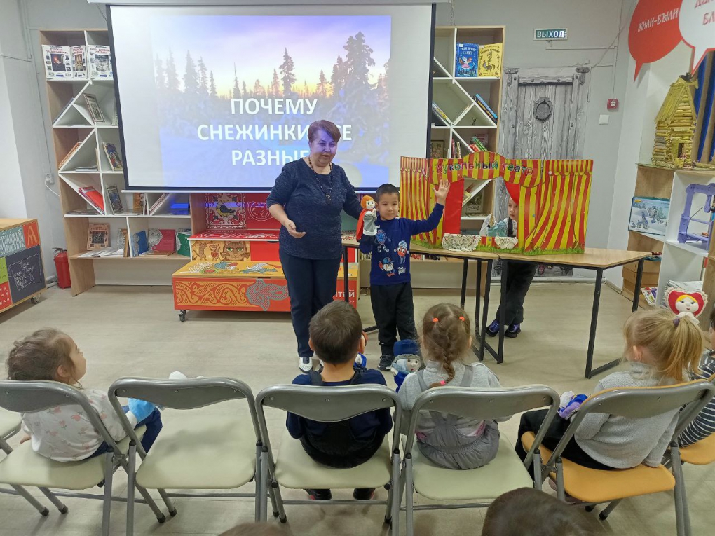 Настоящее снежное чудо ждало малышей: они ознакомились с историей, посвященной снежинкам. Добрая сказка «Почему все снежинки разные» приоткрыла секрет появления изящных узоров на этих хрупких кристаллах, а главный герой – юный Морозко – щедро поделился с ребятами своими волшебными тайнами.