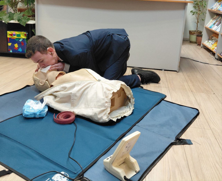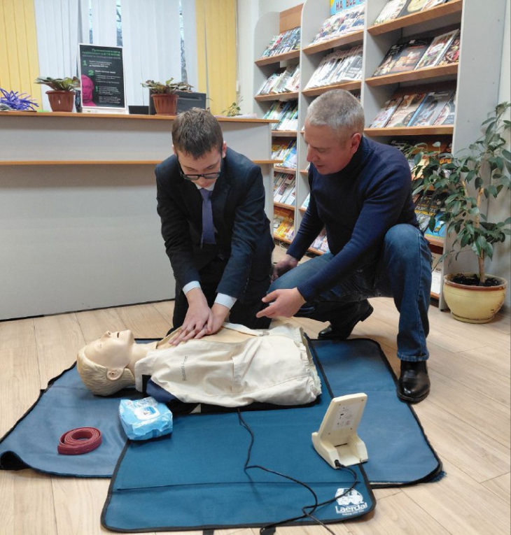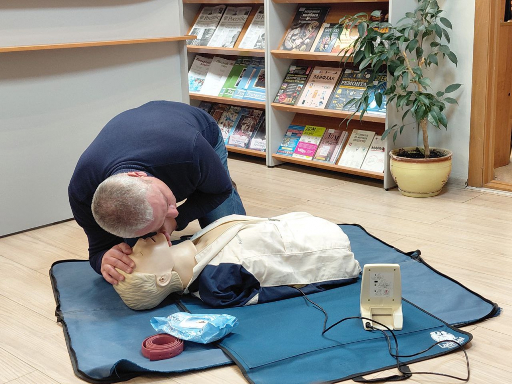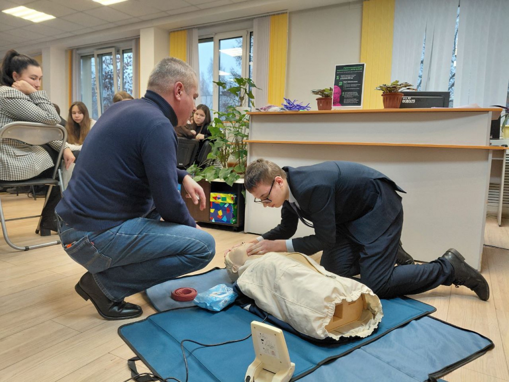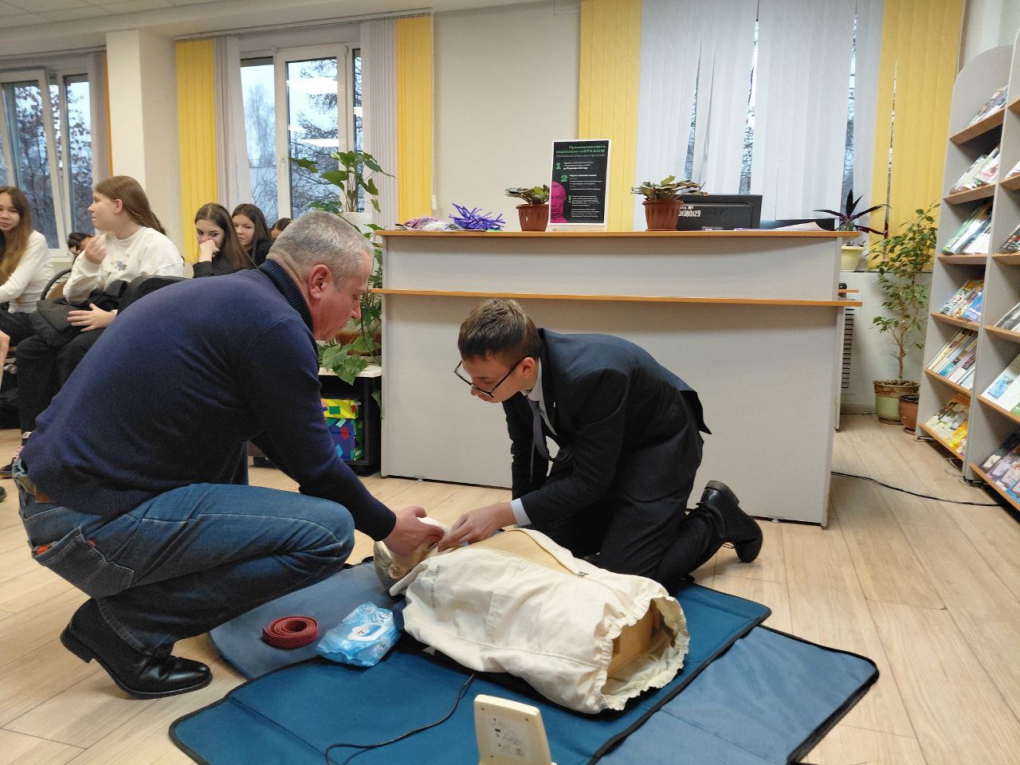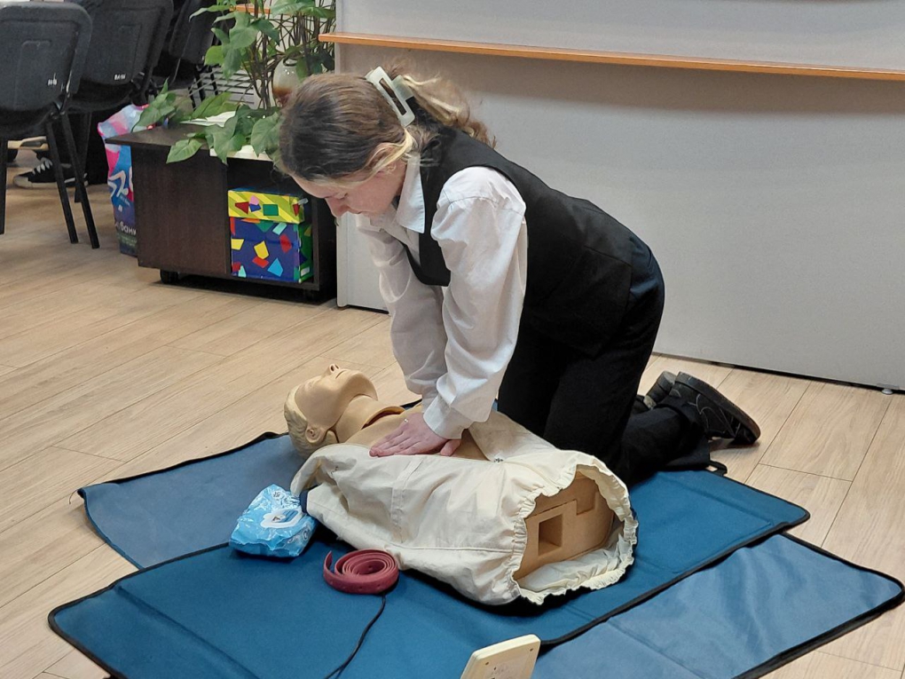 Следующим спикером стал врач-методист Александр Павлов. Он наглядно продемонстрировал приемы оказания первой помощи на манекене. Чтобы закрепить полученные знания, школьники самостоятельно отработали навыки оказания первой помощи на тренировочном оборудовании.