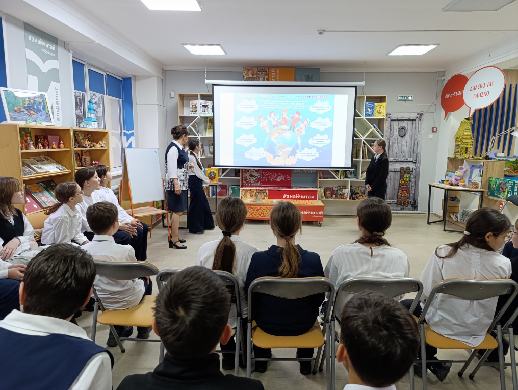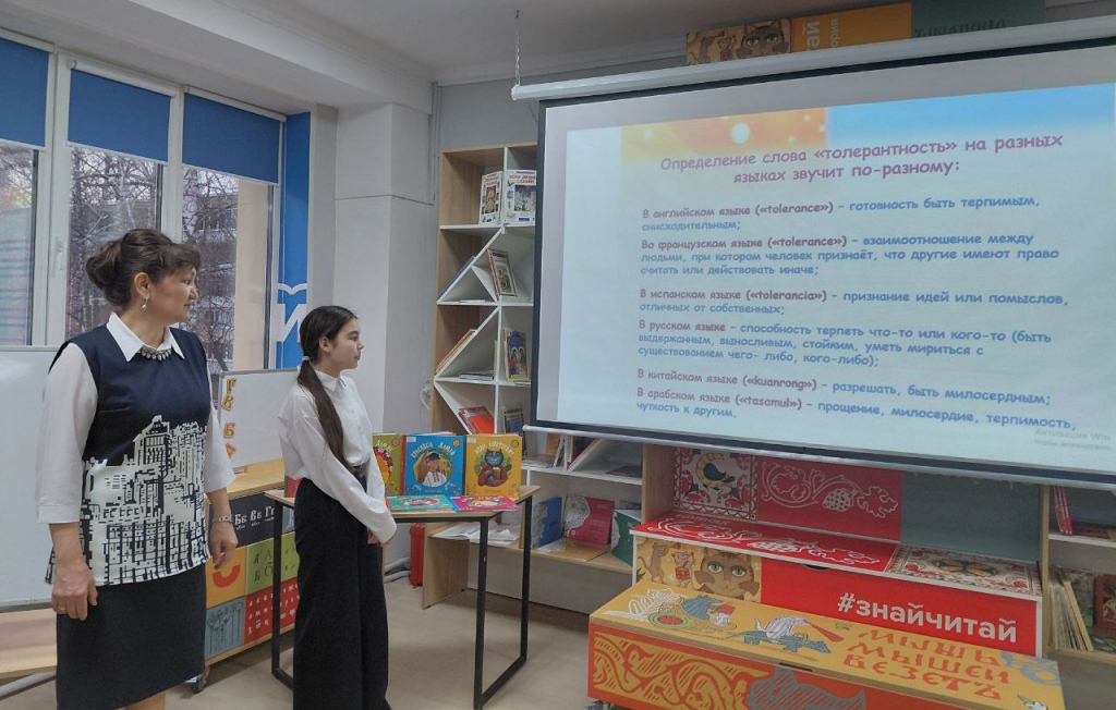 Специалист отдела Татьяна Захарова напомнила школьникам о том, что Международный день толерантности имеет давнюю историю, начиная с 1995 года, когда государства-члены ЮНЕСКО утвердили Декларацию принципов толерантности. В России эта дата отмечается с 2005 года. В ходе исследования переводов термина «толерантность» с шести различных языков – английского, арабского, испанского, китайского, русского и французского – ребята обнаружили, что его значение и звучание варьируются, отражая культурные особенности каждого языка.