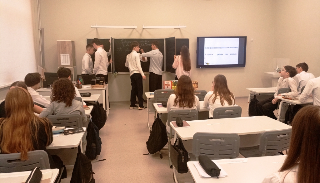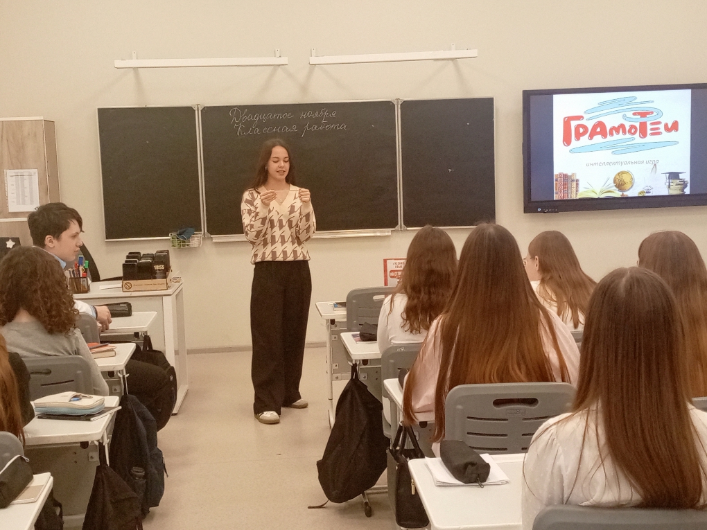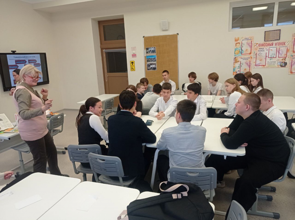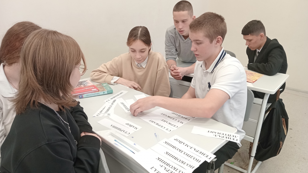 В ходе интеллектуальной игры «Грамотеи» девятиклассники прошли несколько станций, где смогли продемонстрировать свои знания. На станции «Скороговорки» ребята погрузились в мир фольклорных произведений. Они использовали справочное издание «Русские пословицы и поговорки», чтобы отработать правильное произношение звуков и выразительность речи. Далее школьники приняли участие в состязании «Скульптура», которое помогло развить творческое мышление, умение интерпретировать литературные выражения в визуальной форме и глубже понять смысл пословиц и афоризмов. Настоящим сюрпризом стало творческое задание, где участники создавали биографии известных литературных персонажей. Школьники проявили фантазию и креативность, добавляя новые детали и повороты событий. На станции «Считай-ка» обучающиеся практиковались в склонении числительных по падежам.