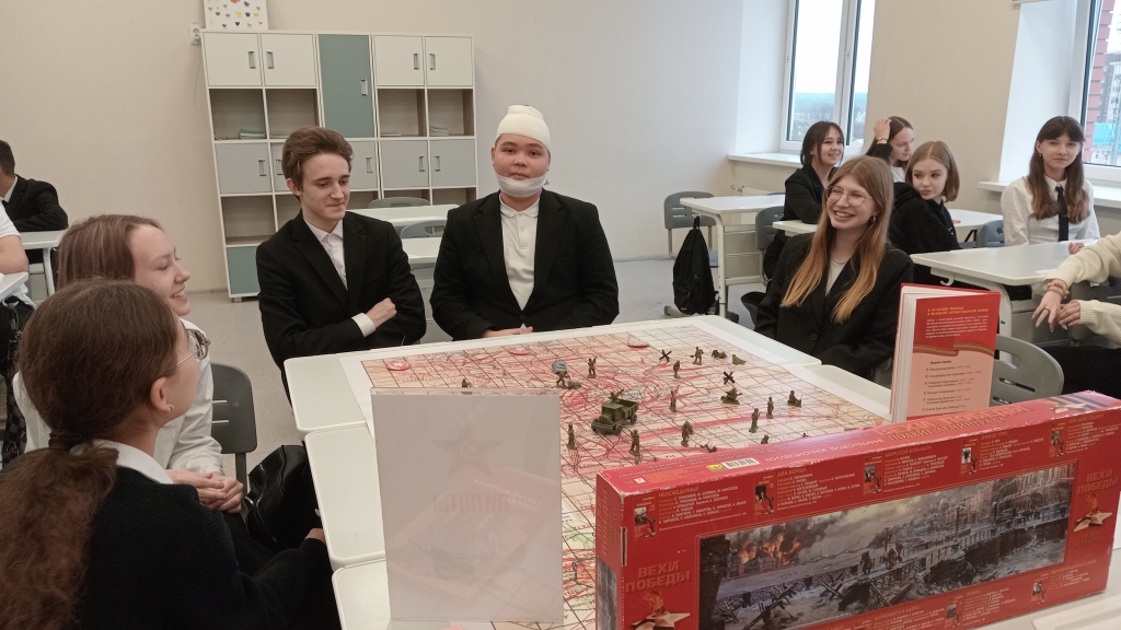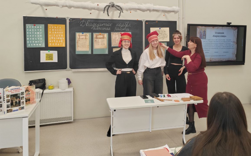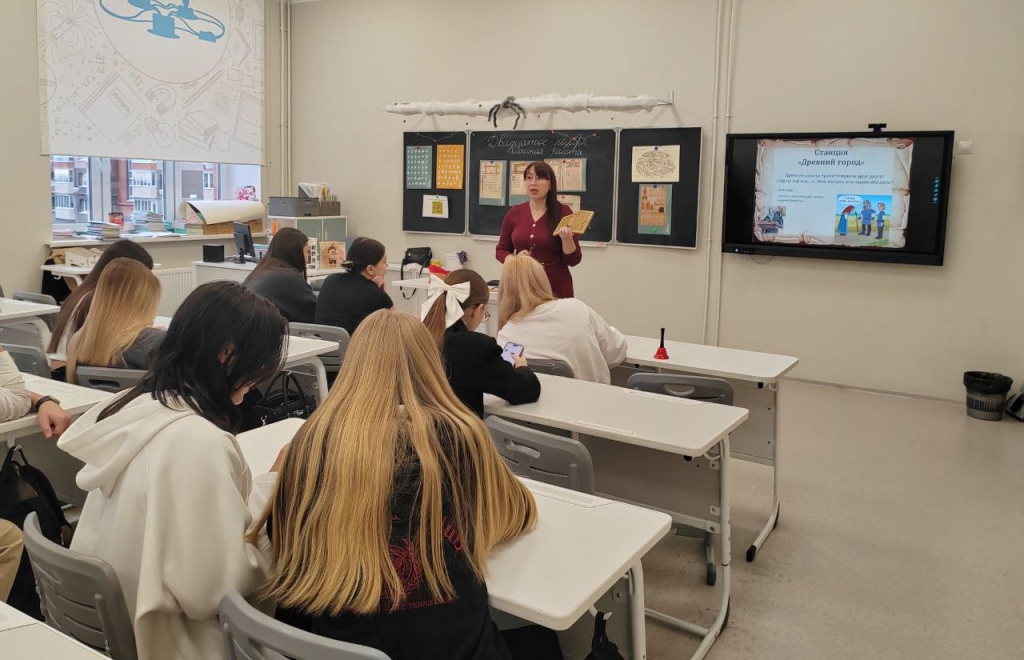 Увлекательное путешествие в прошлое было подготовлено и для одиннадцатого класса – их ждала захватывающая игра «Письмо от древности до современности». Руководитель Лаборатории #ЗнайЧитай Наталья Степанова открыла перед юными исследователями удивительный мир древнерусской письменности, поведав захватывающие истории о появлении первых рукописных книг и становлении книгопечатания на Руси. Старшеклассники погрузились в интеллектуальное состязание, состоящее из нескольких раундов: «Кириллица», «Московия», «Господин Великий Новгород» и «Горница». Ребята с азартом расшифровывали заколдованные слова, разгадывали тайны загадочного сундучка и даже называли части тела на старославянском языке. Особую атмосферу создавал показ уникальных предметов древности: берестяных грамот, цера, писала, пергамента и папируса. За правильные ответы самые эрудированные участники удостаивались почетного звания «грамотеев». Игра стала не просто познавательной встречей, а настоящим путешествием во времени, позволившим юным историкам глубже понять культуру и историю своей страны.