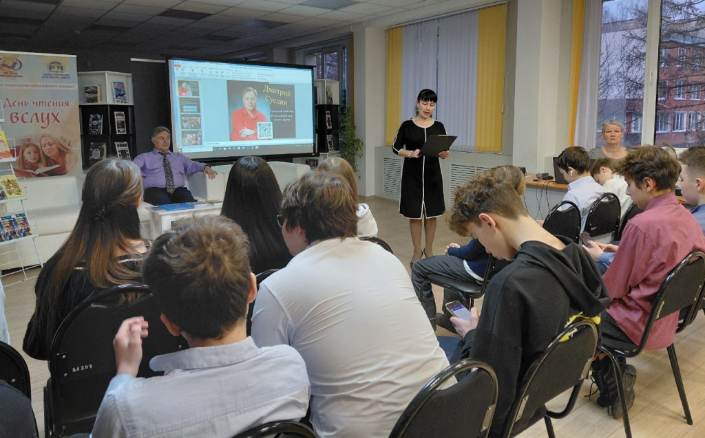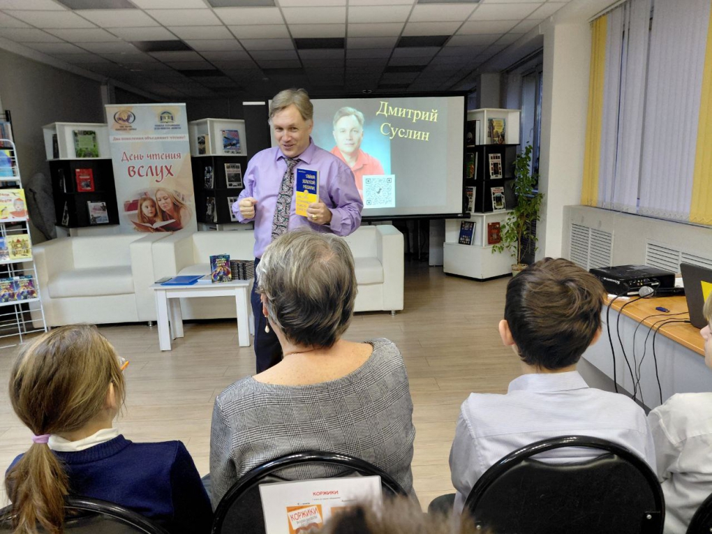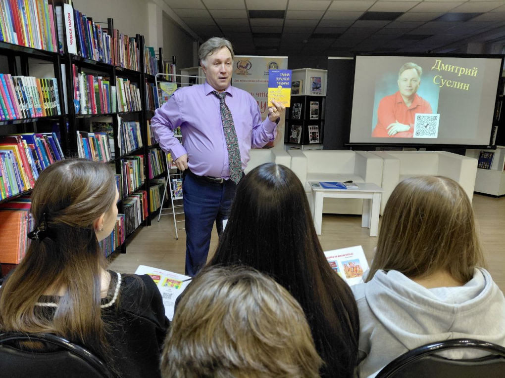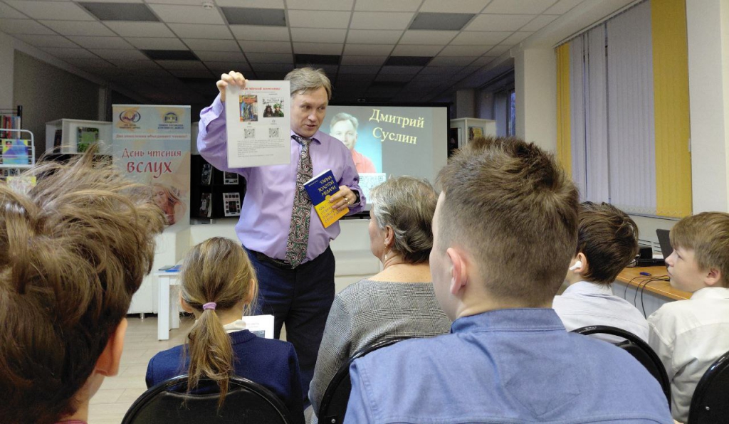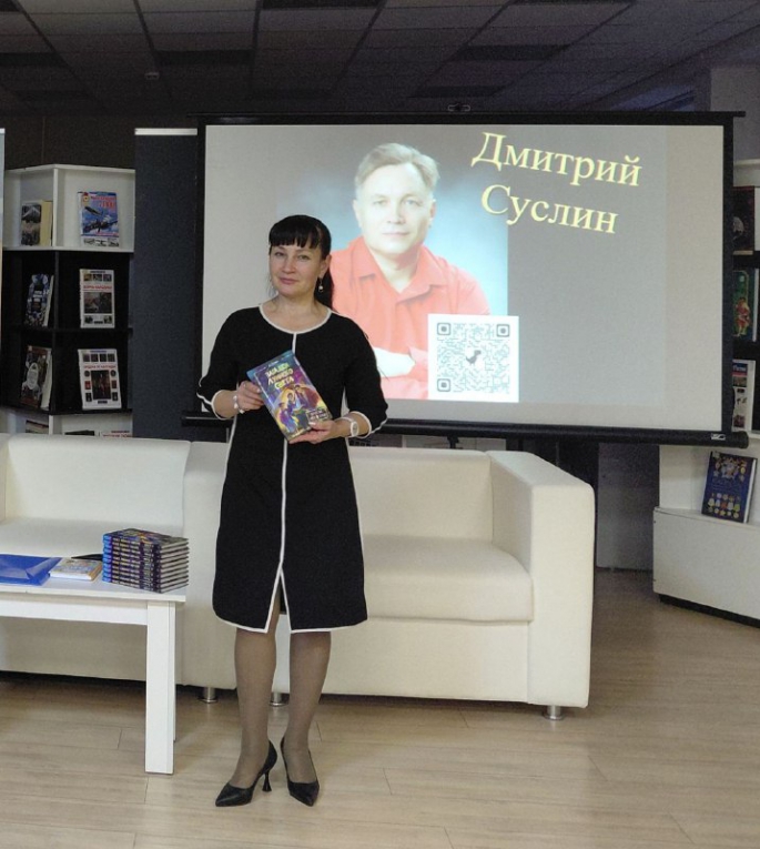 Представляя восьмиклассникам средней общеобразовательной школы № 48 г. Чебоксары творчество популярного писателя, заведующая отделом краеведческой и национальной литературы Эвелина Малеева отметила, что Дмитрий Юрьевич литературным творчеством увлекся еще в студенческие годы, когда обучался в Чувашском государственном университете им. И.Н. Ульянова. В 1994 году в журнале «Лик Чувашии» впервые была опубликована повесть «В ночь полной луны», которая сразу обратила внимание критиков. В дальнейшем его произведения стали издаваться в ведущих издательствах страны, детских журналах и газетах, звучать по радио. Ныне Дмитрий Суслин – автор более 50 книг, созданных в разных жанрах: школьные рассказы, фантастика, детективы, приключения и сказки. Среди них – детские детективы «Загадки лунного света», «Сокровище с неба», которые рассказывают о жизни современных детей и подростков. А книги «Рыцарь Катерино», «Генерал Крузо», «Димка ищет папу», «Валентинка» сразу стали любимыми среди юных читателей. Произведения Дмитрия Суслина переведены на многие языки народов России и зарубежных стран. Более 30 лет Дмитрий Юрьевич работает учителем истории и обществознания в лицее №2 г. Чебоксары.