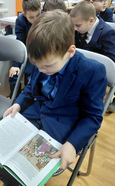 Ознакомившись с историей появления знаменательной для нашей страны датой, дети обратились к изданиям, представленным на выставке и знакомящим с событиями тех огненных лет. Особое внимание уделили рассказу С. Алексеева «Подвиг неизвестного сапера».