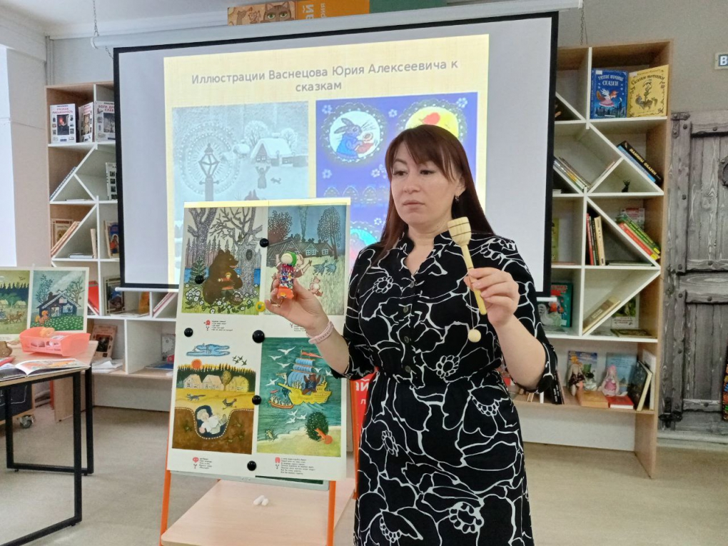 В продолжение встречи участники отгадывали волшебные предметы и героев из тематической инсталляции «Сказка». Среди них: веселый и беззаботный герой домовенок Кузя, который живет в библиотеке и ему всего… семь веков, неугомонный Колобок, добрая кукла-пеленашка Маланья, ворчливая Баба Яга, Кот Баюн обладающий волшебным голосом, русская печка, которая может ездить, волшебный клубок, помогающий героям в добрых делах, волшебная палочка, перо Жар-Птицы, наливное яблочко, меч кладенец и другие.