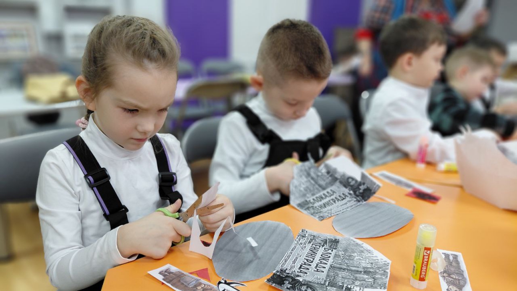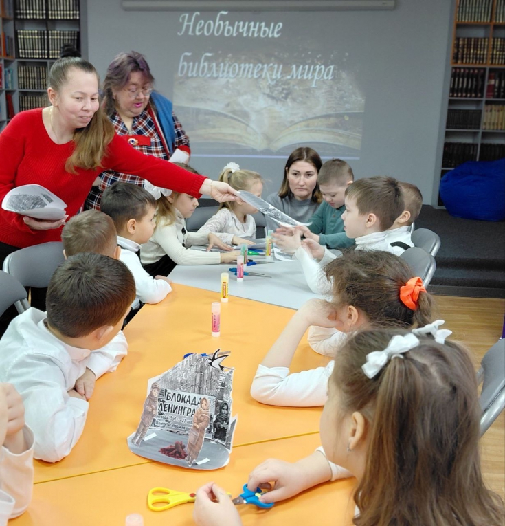 На память о подвиге ленинградцев, в заключительной части путешествия, помогая друг другу, виртуальные путешественники по книжным вселенным изготовили на память объемную открытку «Дети и блокада», приуроченную ко Дню снятия блокады Ленинграда.