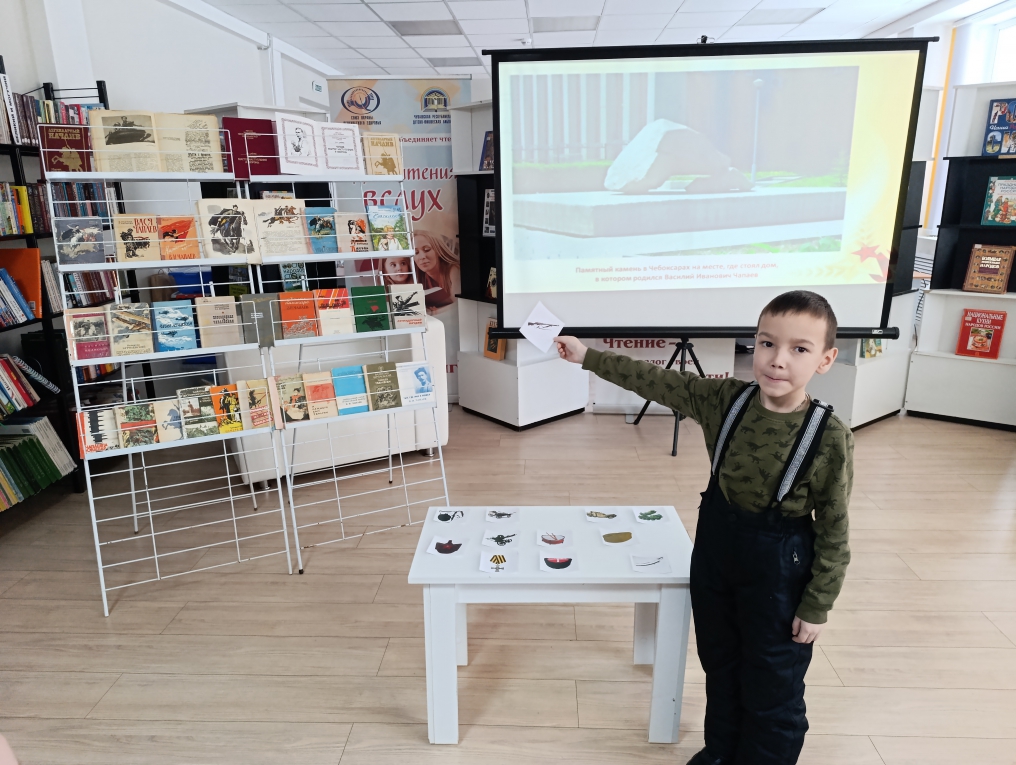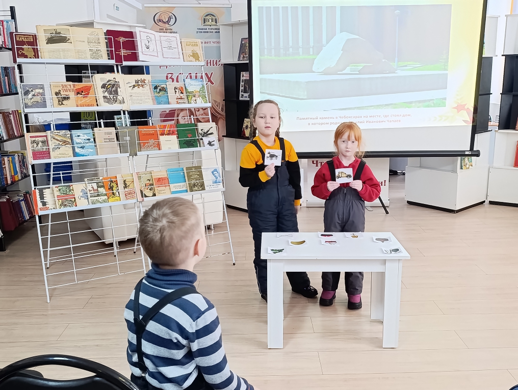 В Чувашской республиканской детско-юношеской библиотеке для воспитанников детского сада №180 города Чебоксары главный библиограф отдела краеведческой и национальной литературы Татьяна Захарова провела экскурсионный час «Легенда Гражданской войны», приуроченный ко дню рождения легендарного героя Гражданской войны Василия Чапаева. Мероприятие состоялось в рамках месячника оборонно-массовой и военно-патриотической работы «Мы – наследники Победы».
