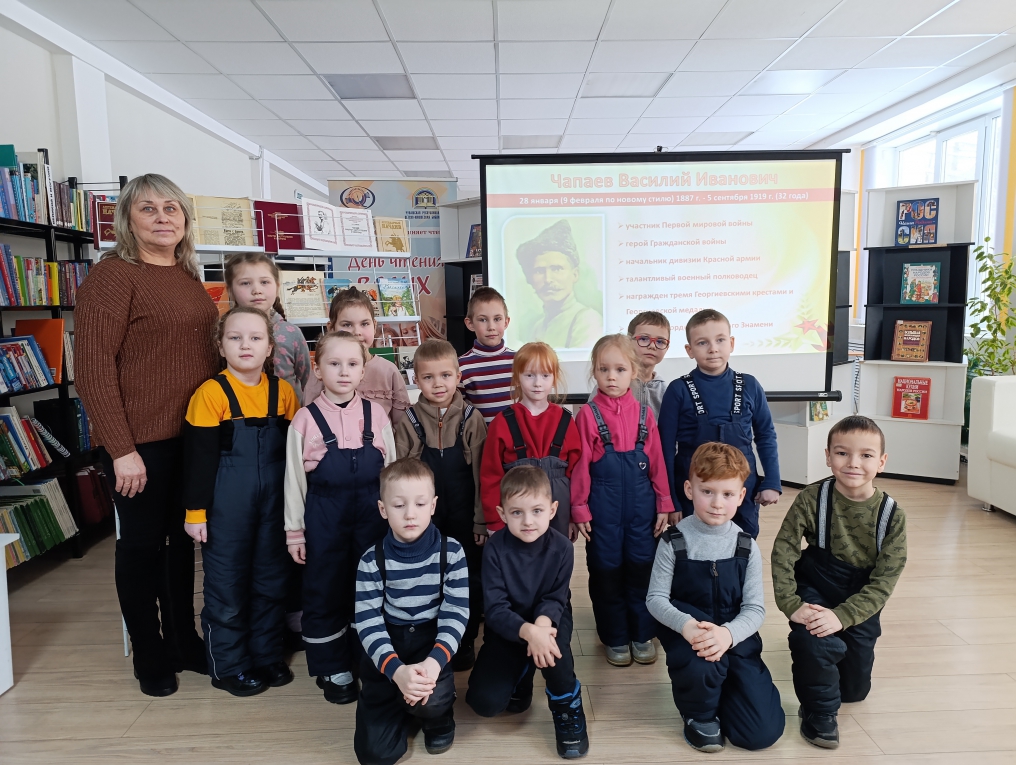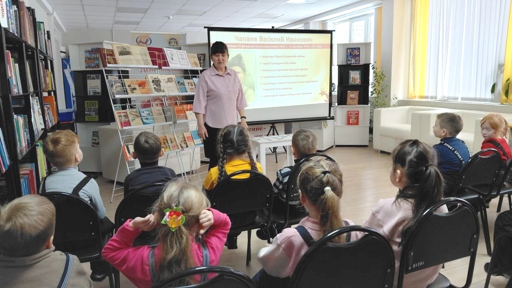 Татьяна Федоровна ознакомила ребят с жизнью и деятельностью военного полководца. Используя мультимедийную презентацию, рассказала, что Василий Чапаев – участник Первой мировой войны, герой Гражданской войны, начальник 25-й дивизии Красной армии. Он родился в многодетной крестьянской семье и своей фамилией Чапаев обязан деду Степану Гаврилову. Учиться Василию довелось совсем немного, но он самостоятельно много читал, чтобы стать грамотным.