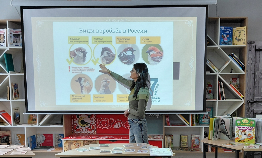 Ольга Михайловна представила научно-популярный обзор о видах воробьёв, распространённых на территории России: домовом и полевом. Юные участники узнали о ключевых морфологических различиях между видами, включая характерное чёрное пятно на груди у домового воробья и контрастные пятна на щеках у полевого.