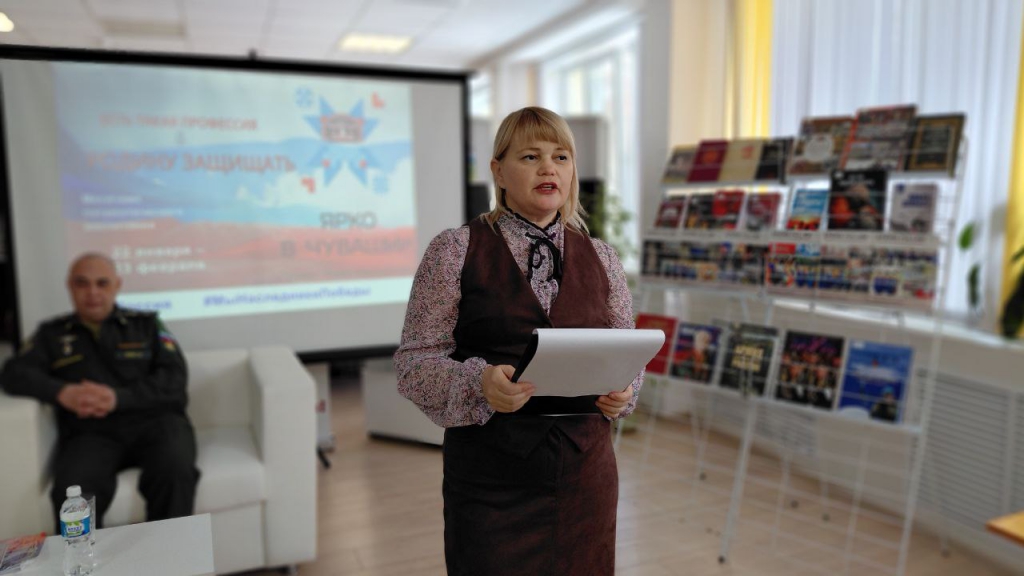 Встреча началась с торжественного открытия. Заведующий отделом обслуживания Елена Ермолаева поприветствовала участников и представила почетных гостей: старшего помощника начальника отделения подготовки граждан к военной службе военного комиссариата Чувашской Республики Евгения Петрова, помощника начальника того же отделения Валерия Степанова и ветерана боевых действий на Северном Кавказе, ветерана специального подразделения МВД России Евгения Александрова.