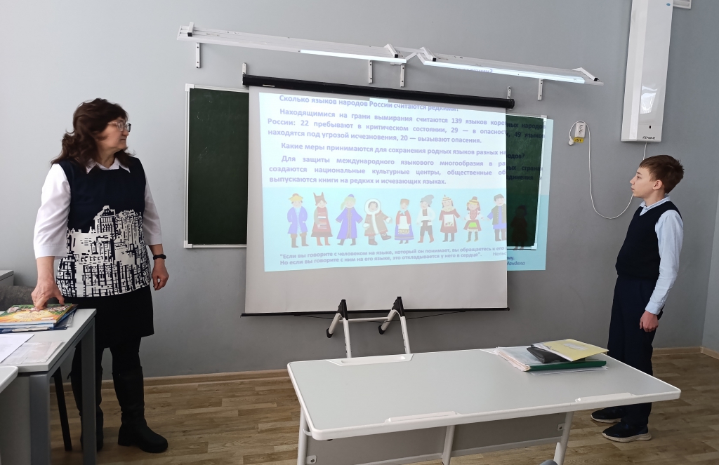 Далее ребята с помощью мультимедийной презентации выяснили, сколько народов проживает на территории России, какие языки сегодня считаются редкими и какие меры предпринимаются для их защиты и развития.