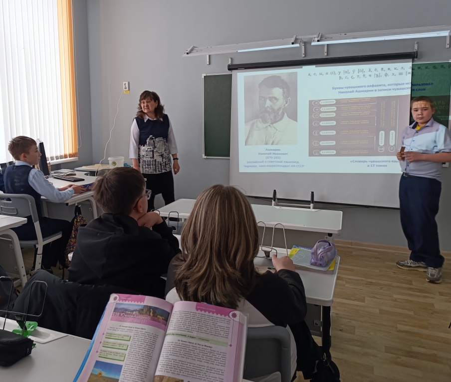 Школьники получили представление об истории чувашской письменности и ее основоположниках. Особое внимание было уделено Ивану Яковлеву – ключевой фигуре в чувашском просвещении, педагогу и организатору народных школ, основателю Симбирской чувашской учительской школы. Его вклад в создание чувашского алфавита неоценим. Первоначальный вариант алфавита, насчитывавший 47 букв, оказался не самым удачным. Однако следующий, более практичный вариант, продержавшийся без изменений полвека, получил название «яковлевский» в честь своего создателя. С течением времени алфавит претерпевал изменения, которые привели к его нынешнему виду.