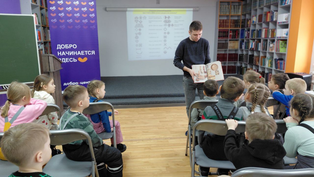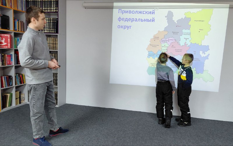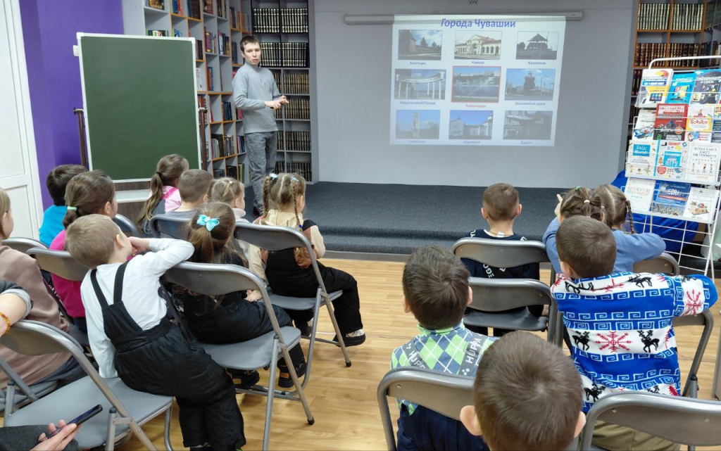 Специалист библиотеки напомнил детям, что они живут в Чувашской Республике, обладающей уникальной культурой и богатым национальным колоритом. Для знакомства с родным краем малыши совершили увлекательное «путешествие» по республике. Библиотекарь подробно рассказал о государственных символах Чувашии, количестве входящих в ее состав городов и муниципальных округов, показывая их расположение на географической карте.