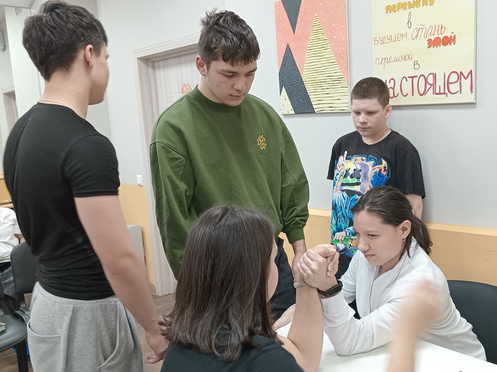 В практической части ребята приняли участие в спортивных состязаниях: «Заряжайся», «Энергия движения», «Физкульт-ура», «Точка опоры». В конкурсе «Секреты здорового питания» участники составляли меню, включавшее только полезные продукты. Кульминацией встречи стал армрестлинг – вид борьбы на руках, в котором подростки проявили силу и волю к победе.