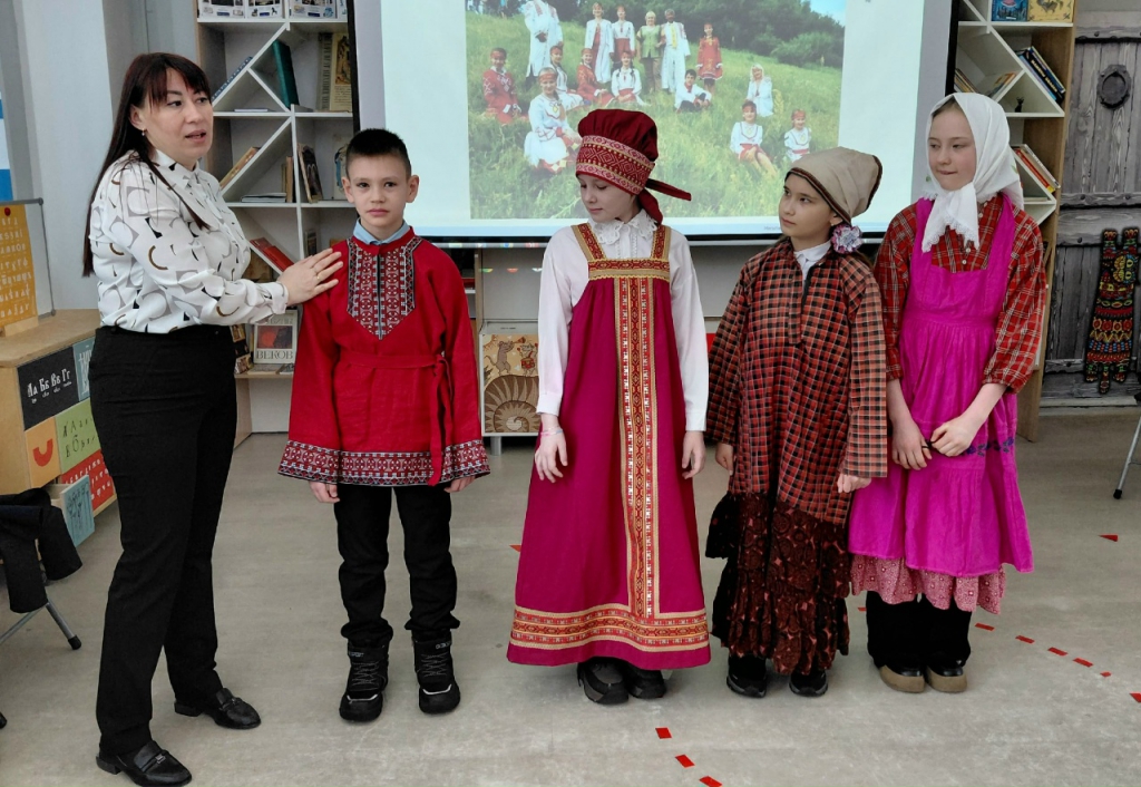 Особое впечатление на детей произвел показ национальной чувашской одежды из «сундука» чувашской семьи. Наталья Сергеевна продемонстрировала традиционные наряды, в которые чуваши облачались на посиделках, и рассказала, что костюмы отличаются в зависимости от района республики. Верховые чуваши (вирьял) носят более сдержанные по цветовой гамме наряды с геометрическими узорами. Средненизовые (анат енчи) сочетают элементы верховых и низовых традиций. Низовые чуваши (анатри) предпочитают яркие цвета и обилие вышивки.