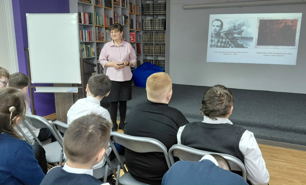 Библиограф отдела краеведческой и национальной литературы библиотеки Татьяна Захарова с помощью мультимедийной презентации подробно рассказала школьникам о жизненном пути Элли Михайловича: его детстве, становлении как художника, ключевых этапах творчества и вкладе в развитие национальной культуры. Яркие слайды позволили ребятам наглядно представить эпоху, в которой жил и работал мастер, и увидеть репродукции его знаковых произведений.