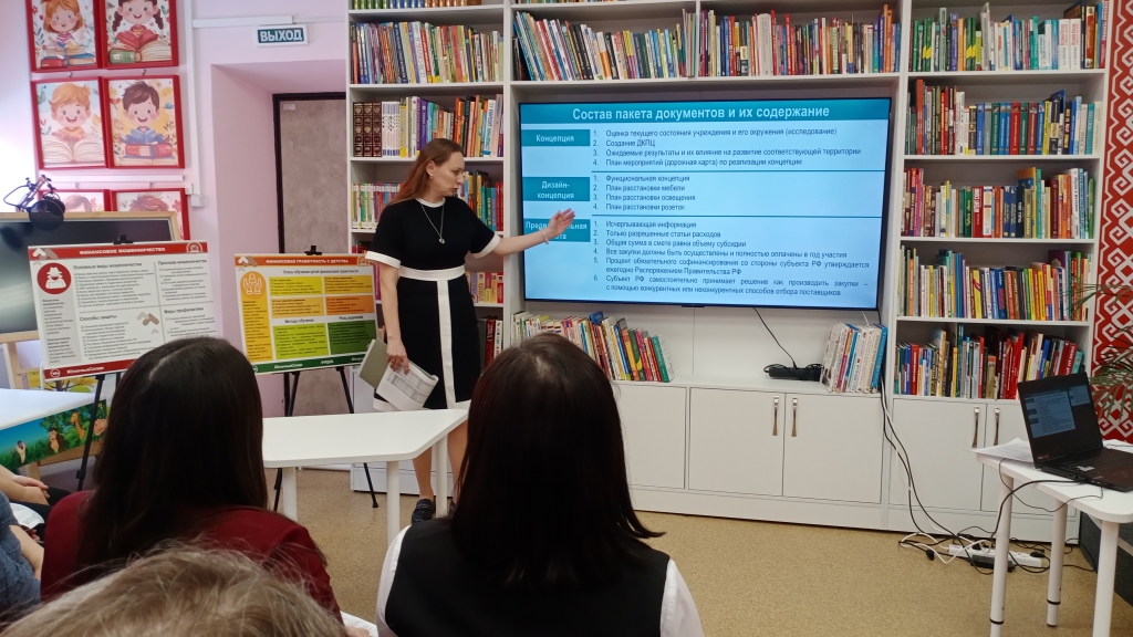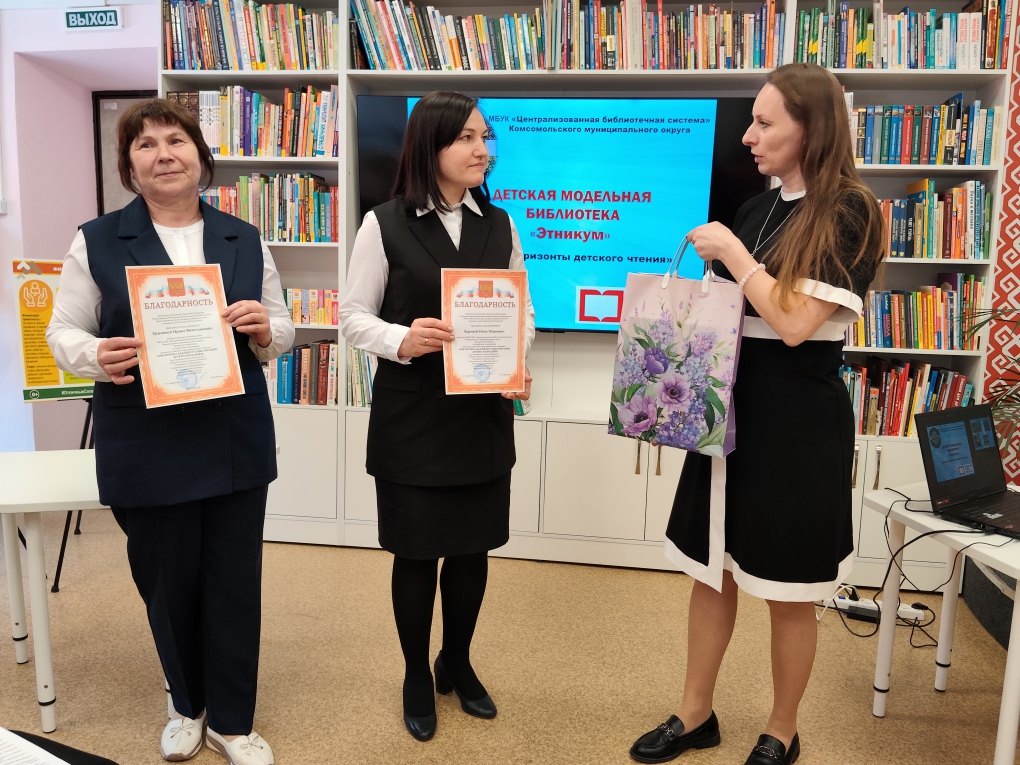 Площадкой для проведения профессиональной встречи стала детская библиотека централизованной библиотечной системы Комсомольского муниципального округа, модернизированная в 2023 году в рамках национального проекта «Культура». Библиотека для детей «Этникум» сочетает современные технологии с акцентом на национальные традиции, предлагая уютные зоны для чтения, мероприятий и этнокультурного просвещения.