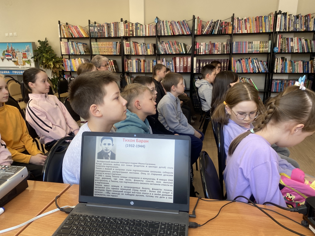 Храбро и мужественно юные патриоты сражались и противостояли врагу, многие из них отдали жизнь за Победу. Десятки тысяч детей и подростков были награждены орденами и медалями. Шестеро ребят – Леня Голиков, Марат Казей, Валя Котик, Зина Портнова, Саша Чекалин и Боря Цариков – за свои подвиги удостоены звания Героев Советского Союза. На их примерах библиотекари объяснили учащимся, что такое подвиг и кого называют героями.