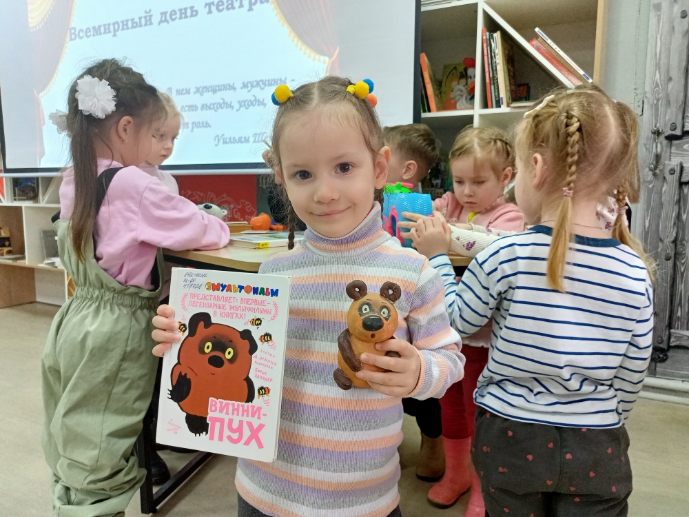 В Чувашской республиканской детско–юношеской библиотеке состоялся комментированный показ фильма–спектакля «Винни–Пух и все–все–все» – событие, ставшее частью Всероссийской акции «Ночь театрального искусства», приуроченное к знаменательному юбилею: 150–летию Союза театральных деятелей Российской Федерации. Зал сектора культурных программ библиотеки превратился в уютный уголок Стоакрового леса, куда отправились в увлекательное путешествие самые юные ценители искусства – воспитанники детского сада №75 г. Чебоксары.