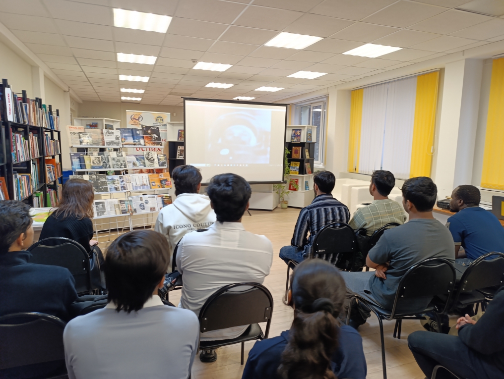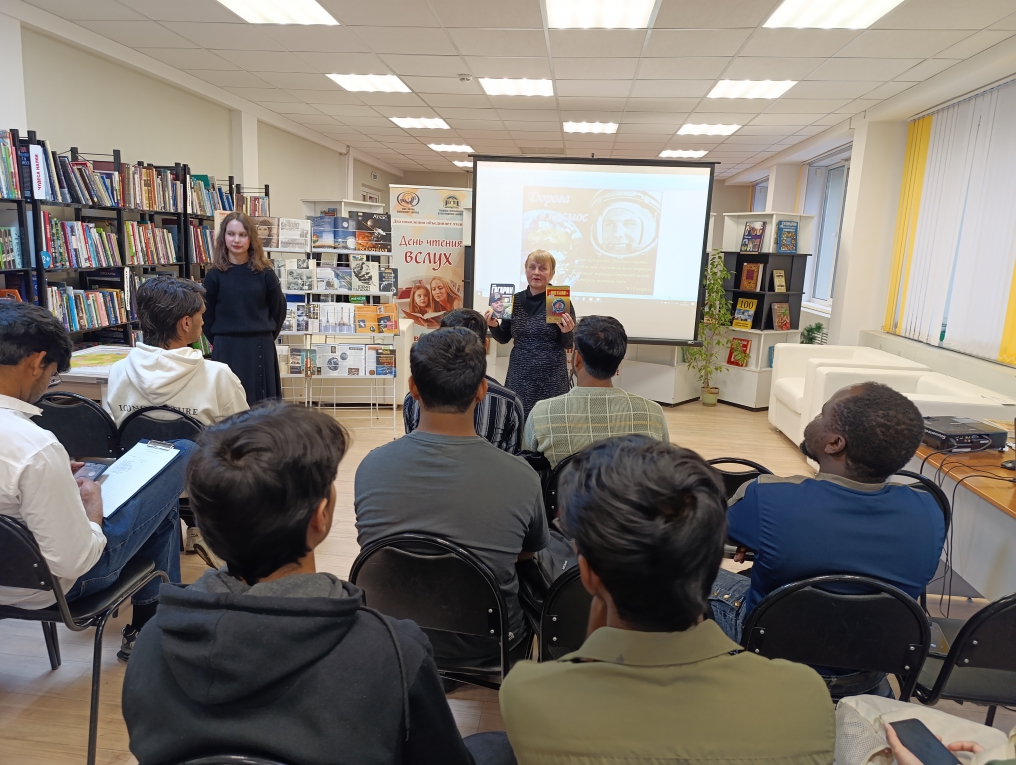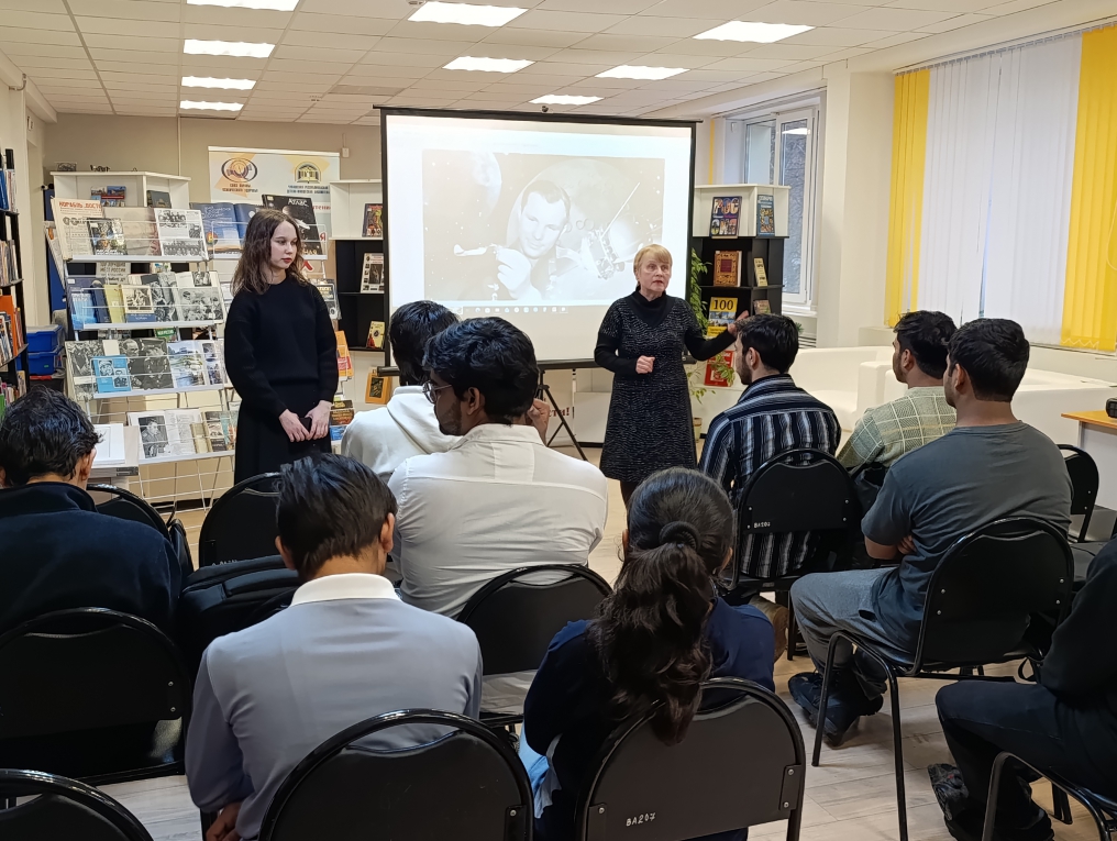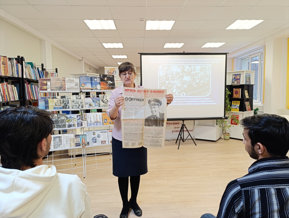 В читальном зале состоялся репортаж «Космическая одиссея: путешествие по страницам». Специалист отдела обслуживания Ирина Иванова рассказала студентам о том, с чего начался путь к звездам, рассказала о семье, детстве и юности легендарного космонавта Юрия Гагарина, его учебе в авиационном училище и отряде по подготовке космонавтов.