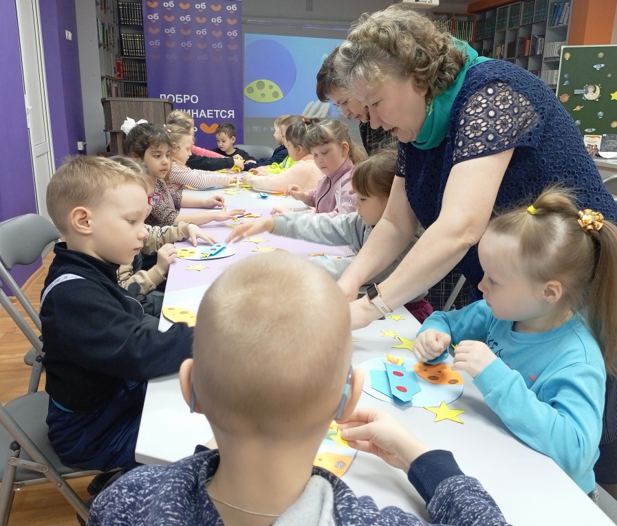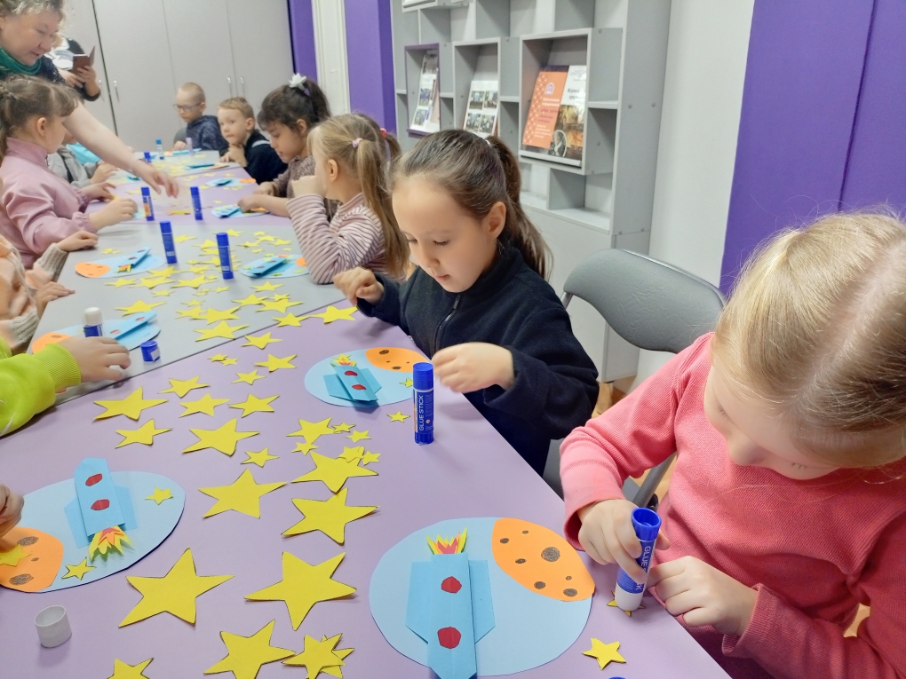 После интеллектуальных испытаний дети приняли участие в мастер-классе «Космическая открытка». Из готовых макетов они создали яркие открытки ко Дню космонавтики – каждая стала маленьким произведением искусства.