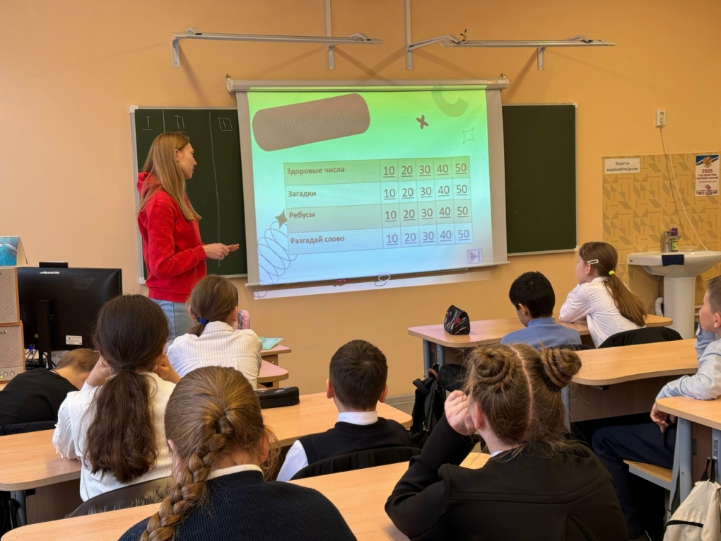 После бодрой разминки настало время перейти к интеллектуальной части. Дарья Сергеевна провела для школьников интерактивную викторину, которая включала четыре категории: «Здоровые числа», «Загадки», «Ребусы» и «Разгадай слово».
