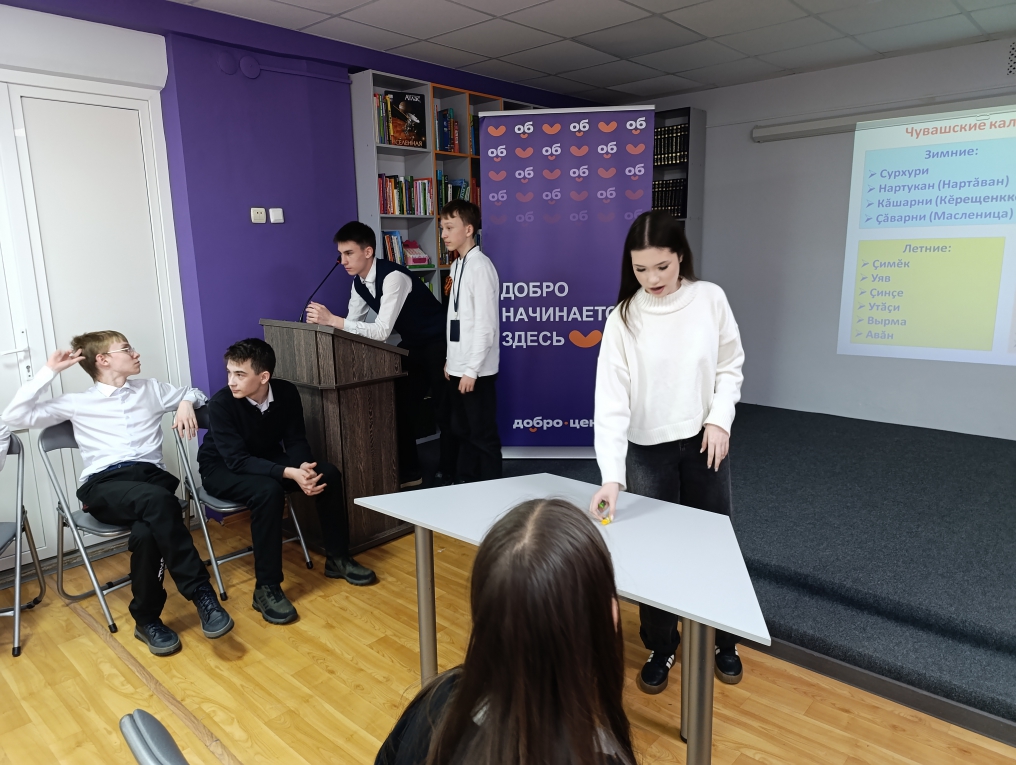 Ребятам было предложено попробовать свои силы в коллективном состязании. Восьмиклассники поделились на четыре команды – «Богатыри», «Солнечные зайчики», «Хӗвел ачисем» и «Чӑваш хӗрӗсем», выбрали капитанов, получили книги по теме. В ходе первого задания представители команд защищали свои ответы и выясняли количество правильных ответов. Во втором задании команды задавали друг другу вопросы по изученной теме. Далее участники команд под зажигательные народные мелодии с азартом играли в традиционные чувашские игры «Пушă пӳртлĕ» (Пустая изба), соревновались на быстроту реакции в игре «Пиҫиххи» (Поясок), и на ловкость – в игре «Камушки». По полученным баллам победительницей стала команда «Хӗвел ачисем».